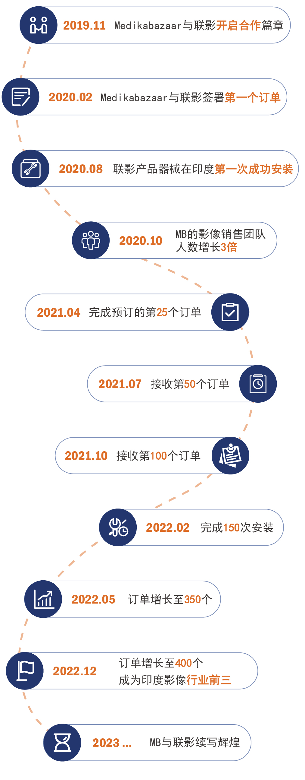 2022年8月,在海得拉巴威斯汀酒店,Medikabazaar与联影医疗举行“Club 300”开放日活动,祝贺联影医疗设备在印度订单数量正式迈入“300台俱乐部”,取代飞利浦成为印度医疗影像行业前三强。